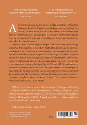 Au IVe siecle, le monachisme fait une timide apparition en Occident, a la faveur des recits de pelerins et d'eveques orientaux refugies en Europe. Quelques siecles plus tard, il occupe une place incontournable dans la societe medievale. L'ouvrage de C. H. Lawrence raconte le prodigieux essor de ce mouvement, ainsi que les nombreuses formes de vie religieuse auxquelles il a donne naissance. Le moine, selon la celebre Regle etablie par saint Benoit au VIe siecle, partage sa journee entre la priere, le travail et l'etude. Mais la necessite de gerer des monasteres au patrimoine et aux revenus toujours plus importants, de repondre aux sollicitations des pouvoirs temporel et ecclesiastique, d'accorder une place aux femmes dans les maisons religieuses, ou encore de faire face a l'apparition de l'universite obligerent parfois les religieux a deroger aux exigences premieres de la vie monastique. Au cours du Moyen Age, de l'Irlande a l'Italie, les hommes et les femmes vouant leur vie au service de Dieu apporterent de multiples reponses aux defis poses par ces evolutions. Ces reponses donnerent naissance a autant de mouvements religieux (Cluny, Citeaux, Grandmont, Sempringham...; chanoines, templiers, freres precheurs...) dont C. H. Lawrence dresse un portrait saisissant de force et de vitalite.