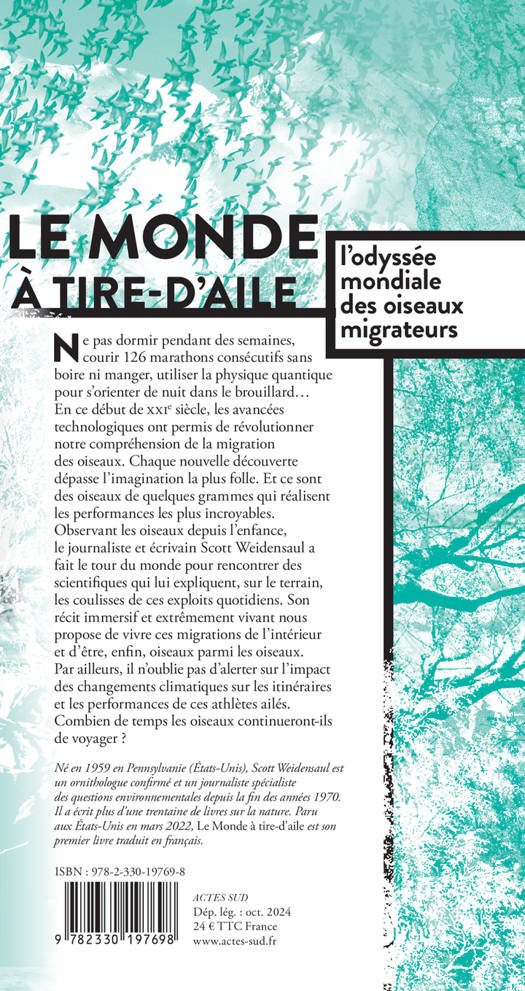 Ne pas dormir pendant des semaines, courir 126 marathons consécutifs sans boire ni manger, utiliser la physique quantique pour s'orienter de nuit dans le brouillard... En ce début de XXIe siècle, les avancées technologiques ont permis de révolutionner notre compréhension de la migration des oiseaux. Chaque nouvelle découverte dépasse l'imagination la plus folle. Et ce sont des oiseaux de quelques grammes qui réalisent les performances les plus incroyables. Observant les oiseaux depuis l'enfance, le journaliste et écrivain Scott Weidensaul a fait le tour du monde pour rencontrer des scientifiques qui lui expliquent, sur le terrain, les coulisses de ces exploits quotidiens. Son récit immersif et extrêmement vivant nous propose de vivre ces migrations de l'intérieur et d'être, enfin, oiseaux parmi les oiseaux. Par ailleurs, il n'oublie pas d'alerter sur l'impact des changements climatiques sur les itinéraires et les performances de ces athlètes ailés. Combien de temps les oiseaux continueront-ils de voyager ?