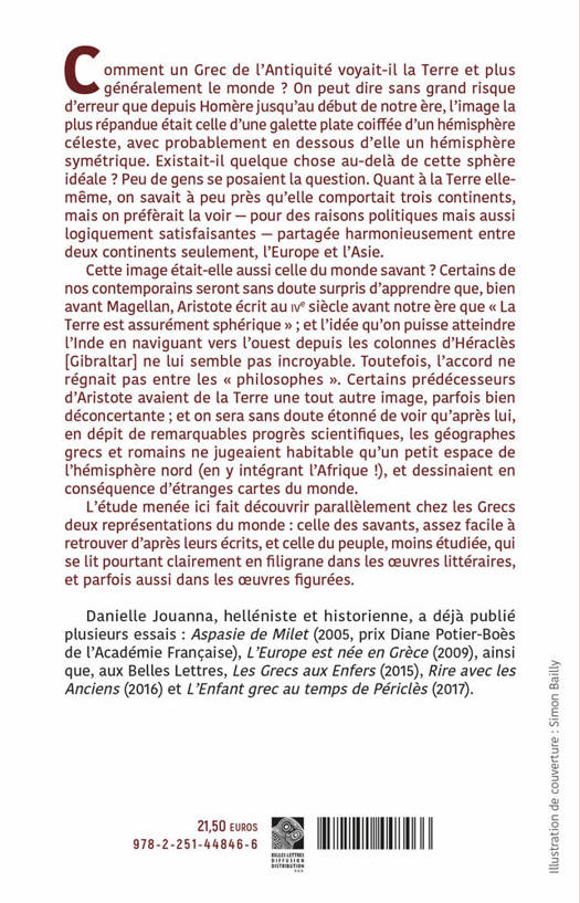 Comment un Grec de l’Antiquité voyait-il la Terre et plus généralement le monde ? On peut dire sans grand risque d’erreur que depuis Homère jusqu’au début de notre ère, l’image la plus répandue était celle d’une galette plate coiffée d’un hémisphère céleste, avec probablement en dessous d’elle un hémisphère symétrique. Existait-il quelque chose au-delà de cette sphère idéale ? Peu de gens se posaient la question. Quant à la Terre elle-même, on savait à peu près qu’elle comportait trois continents, mais on préfèrait la voir — pour des raisons politiques mais aussi logiquement satisfaisantes — partagée harmonieusement entre deux continents seulement, l’Europe et l’Asie. Cette image était-elle aussi celle du monde savant ? Certains de nos contemporains seront sans doute surpris d’apprendre que, bien avant Magellan, Aristote écrit au IVe siècle avant notre ère que « La Terre est assurément sphérique » ; et l’idée qu’on puisse atteindre l’Inde en naviguant vers l’ouest depuis les colonnes d’Héraclès [Gibraltar] ne lui semble pas incroyable. Toutefois, l’accord ne régnait pas entre les « philosophes ». Certains prédécesseurs d’Aristote avaient de la Terre une tout autre image, parfois bien déconcertante ; et on sera sans doute étonné de voir qu’après lui, en dépit de remarquables progrès scientifiques, les géographes grecs et romains ne jugeaient habitable qu’un petit espace de l’hémisphère nord (en y intégrant l’Afrique !), et dessinaient en conséquence d’étranges cartes du monde. L’étude menée ici fait découvrir parallèlement chez les Grecs deux représentations du monde : celle des savants, assez facile à retrouver d’après leurs écrits, et celle du peuple, moins étudiée, qui se lit pourtant clairement en filigrane dans les œuvres littéraires, et parfois aussi dans les œuvres figurées.