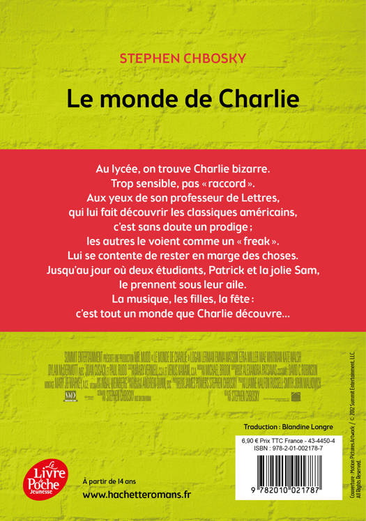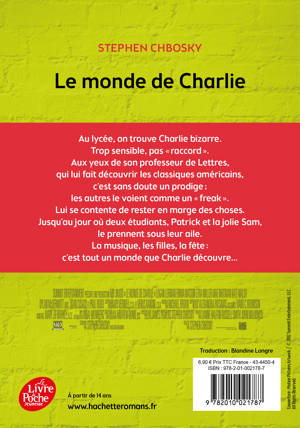 Au lycée, on trouve Charlie bizarre. Trop sensible, pas « raccord ». Aux yeux de son professeur de Lettres, qui lui fait découvrir les classiques américains, c’est sans doute un prodige ; les jeunes de son âge, eux, le voient comme un « freak ». Lui se contente de rester en marge des choses. Jusqu’au jour où deux seniors, Patrick et la jolie Sam, le prennent sous leur aile. La musique, le sexe, les fêtes : il va bien falloir que Charlie « s’implique». Une fois entré dans la danse,c'est tout un monde que Charlie découvre…