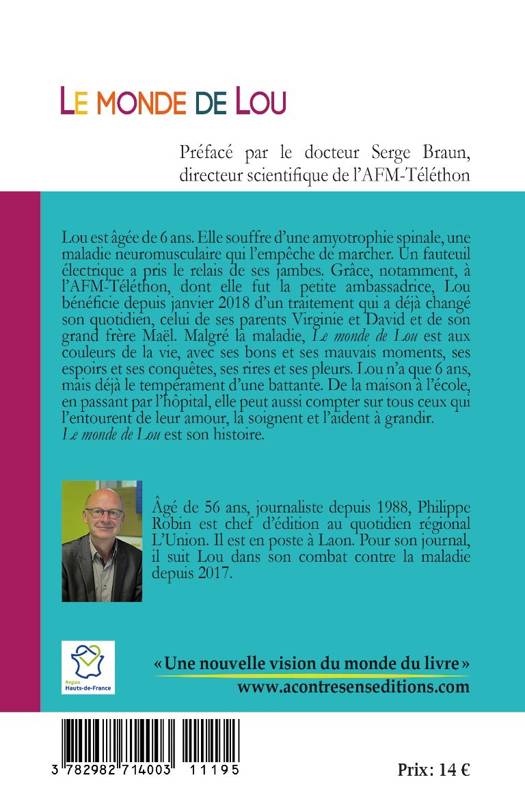 Argumentaire Tout le monde connaît le Téléthon, grand rendez-vous de la générosité qui, depuis 1987, occupe les chaînes de France Télévisions chaque début décembre. Qui connaît vraiment, en revanche, le quotidien d'une fillette que soutient l'AFM-Téléthon, avec ses moments de doute et d'espoir, les instants de bonheur partagés de sa famille mais aussi, parfois, la peur du lendemain ? Avec Le monde de Lou, Philippe Robin va bien au-delà du travail de journaliste. Il nous prend par la main pour suivre Lou, dans sa maison bien sûr, mais aussi à l'école, chez sa nounou ou encore auprès de sa kinésithérapeute. « Qui mieux qu’un journaliste pour comprendre que c’est dans le quotidien que se découvrent le plus impitoyable et le plus magnifique, le plus indicible et le plus lumineux ? Qui mieux que la réalité de la vie pour nous apprendre à l’affronter et à la transcender ?», relève le Dr Serge Braun, directeur scientifique de l'AFM-Téléthon, dans la préface de cet ouvrage.