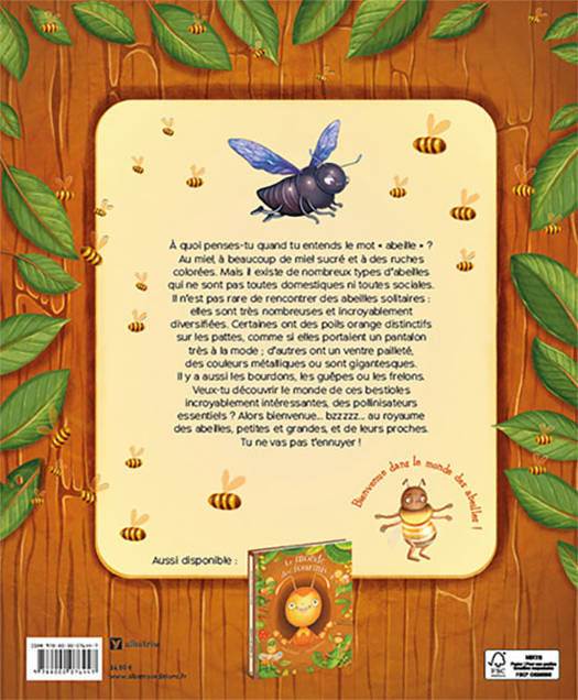 Ce livre explore le monde diversifié des abeilles et des familles associées, comme les abeilles solitaires, les abeilles mellifères, les bourdons, les guêpes et les frelons. Il met en avant les caractéristiques uniques de chaque espèces, de leurs pattes orange à leur ventre scintillant, et souligne leur rôle essentiel en tant que pollinisatrices. Il présente aux enfants la grande diversité des espèces d‘abeilles et éveille leur curiosité pour le monde des insectes.