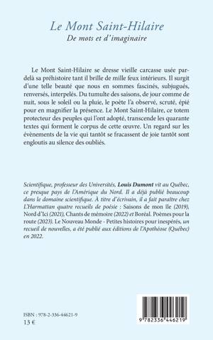 Le Mont Saint-Hilaire se dresse vieille carcasse usée par-delà sa préhistoire tant il brille de mille feux intérieurs. Il surgit d’une telle beauté que nous en sommes fascinés, subjugués, renversés, interpelés. Du tumulte des saisons, de jour comme de nuit, sous le soleil ou la pluie, le poète l’a observé, scruté, épié pour en magnifier la présence. Le Mont Saint-Hilaire, ce totem protecteur des peuples qui l’ont adopté, transcende les quarante textes qui forment le corpus de cette œuvre. Un regard sur les évènements de la vie qui tantôt se fracassent de joie tantôt sont engloutis au silence des oubliés.