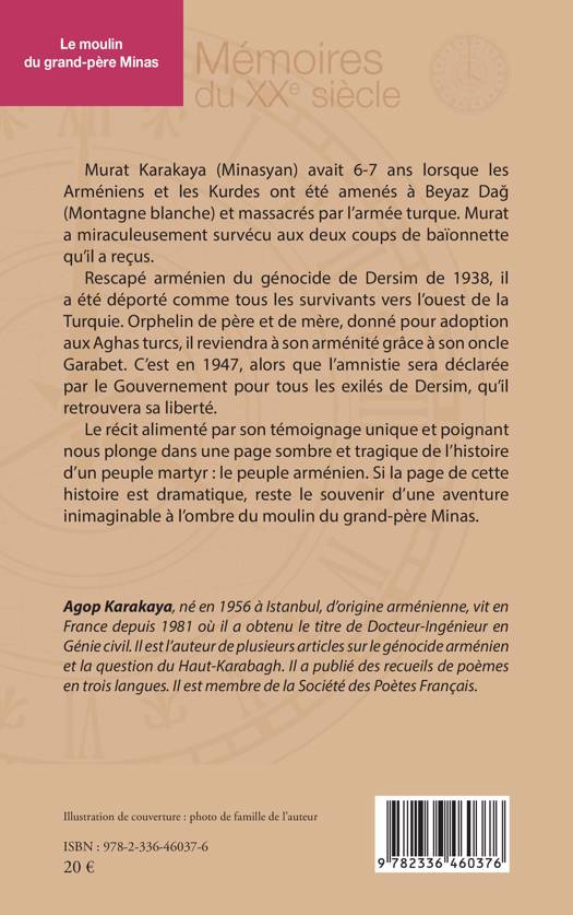 Murat Karakaya (Minasyan) avait 6-7 ans lorsque les Arméniens et les Kurdes ont été amenés à Beyaz Dağ (Montagne blanche) et massacrés par l’armée turque. Murat a miraculeusement survécu aux deux coups de baïonnette qu’il a reçus. Rescapé arménien du génocide de Dersim de 1938, il a été déporté comme tous les survivants vers l’ouest de la Turquie. Orphelin de père et de mère, donné pour adoption aux Aghas turcs, il reviendra à son arménité grâce à son oncle Garabet. C’est en 1947, alors que l’amnistie sera déclarée par le Gouvernement pour tous les exilés de Dersim, qu’il retrouvera sa liberté. Le récit alimenté par son témoignage unique et poignant nous plonge dans une page sombre et tragique de l’histoire d’un peuple martyr : le peuple arménien. Si la page de cette histoire est dramatique, reste le souvenir d’une aventure inimaginable à l’ombre du moulin du grand-père Minas.