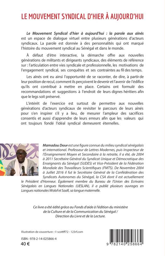 Ce livre est un espace de dialogue virtuel entre plusieurs générations d’acteurs syndicaux. La parole est donnée à des personnalités qui ont marqué l’histoire du mouvement syndical au Sénégal et dans le monde. La démarche offre aux nouvelles générations de militants et dirigeants syndicaux, des éléments de référence sur : l’articulation entre vies syndicale et professionnelle, les motivations de l’engagement syndical, ses conquêtes et ses contraintes au fil des temps. L’intérêt de l’exercice est surtout de leur permettre de revisiter le parcours de leurs aînés pour s’en inspirer s’il y a lieu, de mesurer l’ampleur des sacrifices consentis et aussi d’apprendre de leurs erreurs afin que les valeurs qui ont toujours fondé l’idéal syndical demeurent éternelles.
