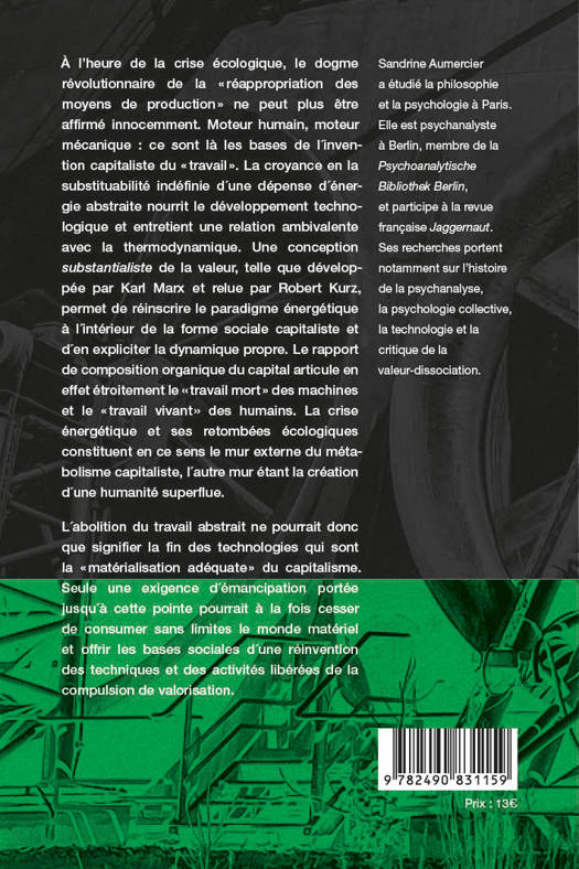 À l'heure de la crise écologique, le dogme révolutionnaire de la « réappropriation des moyens de production » ne peut plus être affirmé innocemment. Moteur humain, moteur mécanique : ce sont là les bases de l'invention capitaliste du « travail ». La croyance en la substituabilité indéfinie d'une dépense d'énergie abstraite nourrit le développement technologique et entretient une relation ambivalente avec la thermodynamique. L'abolition du travail abstrait ne pourrait donc que signifier la fin des technologies qui sont la « matérialisation adéquate » du capitalisme. Seule une exigence d'émancipation portée jusqu'à cette pointe pourrait à la fois cesser de consumer sans limites le monde matériel et offrir les bases sociales d'une réinvention des techniques et des activités libérées de la compulsion de valorisation.