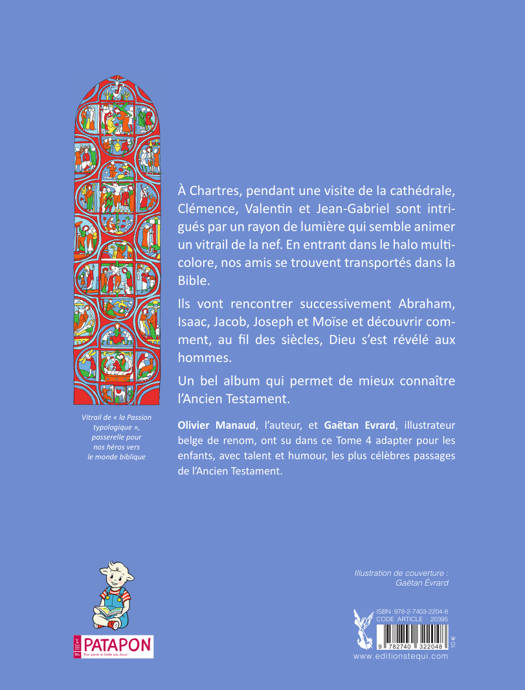 L’intrigue commence à Chartres. Lors d’une visite de la cathédrale, Clémence, Valentin et Jean-Gabriel sont intrigués par un rayon de lumière qui semble animer un vitrail de la nef. En entrant dans le halo multicolore, nos amis se trouvent introduits à l’époque des Patriarches. Ils rencontrent successivement Abraham, Isaac, Jacob, Joseph et Moïse et découvrent comment, au fil des siècles, Dieu s’est progressivement révélé aux hommes. Dans l’esprit du Voyage à Pardonia, le mystérieux vitrail sera la passerelle entre notre monde et celui de la Bible. Les enfants passent de l’un à l’autre grâce au rayon de lumière qui les téléporte. Pour chaque épisode, ils sont impliqués dans les scènes bibliques. Un bel album qui permet de mieux connaître l’Ancien Testament tout en mettant en lumière les liens avec le Nouveau Testament et en montrant comment ces épisodes bibliques préfigurent la venue et les révélations de Jésus.