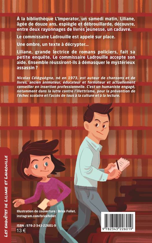 À la bibliothèque L’Imperator, un samedi matin, Liliane, âgée de douze ans, espiègle et débrouillarde, découvre, entre deux rayonnages de livres jeunesse, un cadavre. Le commissaire Ladrouille est appelé sur place. Une ombre, un texte à décrypter... Liliane, grande lectrice de romans policiers, fait sa petite enquête. Le commissaire Ladrouille accepte son aide. Ensemble réussiront-ils à démasquer le mystérieux assassin ?