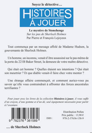 Tout commença par un message affolé de Madame Hudson, la gouvernante de Sherlock Holmes. <br /><br /> Un homme, un inconnu, venait d'être assassiné sur le pas même de la porte du 221B Baker Street, la demeure de votre maître détective. <br /><br /> Qui était cet homme ? Quelles étaient ses intentions ? Qui était son meurtrier ? Et que diable venait-il faire chez votre mentor ? <br /><br /> Une étrange affaire commençait, et comment auriez-vous pu savoir qu'elle vous contraindrait à affronter des forces ancestrales terrifiantes ?