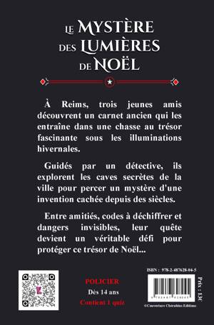 ÀReims, trois jeunes amis découvrent un carnet ancien qui les entraîne dans une chasse au trésor fascinante sous les illuminations hivernales.Guidés par un détective, ils explorent les caves secrètes de la ville pour percer un mystère d'une invention cachée depuis des siècles.Entre amitiés, codes à déchiffrer et dangers invisibles, leur quête devient un véritable défi pour protéger ce trésor de Noël...