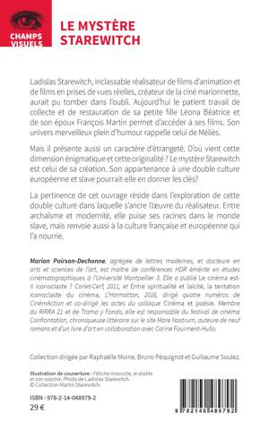 Ladislas Starewitch, inclassable réalisateur de films d'animation et de films en prises de vues réelles, créateur de la ciné marionnette, aurait pu tomber dans l'oubli. Aujourd'hui le patient travail de collecte et de restauration de sa petite fille Léona Béatrice et de son époux François Martin permet d'accéder à ses films. Son univers merveilleux plein d'humour rappelle celui de Méliès. Mais il présente aussi un caractère d'étrangeté. D'où vient cette dimension énigmatique et cette originalité ? Le mystère Starewitch est celui de sa création. Son appartenance à une double culture européenne et slave pourrait-elle en donner les clés? La pertinence de cet ouvrage réside dans l'exploration de cette double culture dans laquelle s'ancre l'oeuvre du réalisateur. Entre archaïsme et modernité, elle puise ses racines dans le monde slave, mais renvoie aussi à la culture française et européenne qui l'a nourrie.