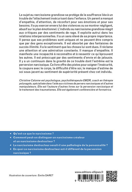 Dans cette ouvrage, l’auteure donne un descriptif complet du sujet au narcissisme grandiose. Elle offre également des pistes pour soigner l’insécurité, la coupure avec le corps, la difficulté d’être soi, le manque d’estime de soi sous-jacent au sentiment de supériorité présent chez cet individu.