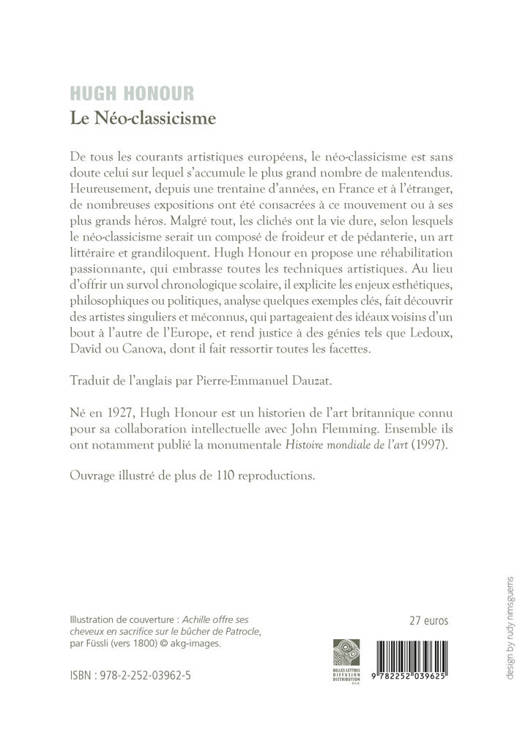 English summary: Neo-classicism is often misunderstood as a cold, pedantic, even bombastic artistic movement. The present volume seeks to rehabilitate Neo-classicism, explaining its esthetic, philosophical, and political implications, through the example of both famous and little-known artists from across Europe. French description: De tous les courants artistiques europeens, le neo-classicisme est sans doute celui sur lequel s'accumule le plus grand nombre de malentendus. Heureusement, depuis une trentaine d'annees, en France et a l'etranger, de nombreuses expositions ont ete consacrees a ce mouvement ou a ses plus grands heros. Malgre tout, les cliches ont la vie dure, selon lesquels le neo-classicisme serait un compose de froideur et de pedanterie, un art litteraire et grandiloquent. Hugh Honour en propose une rehabilitation passionnante, qui embrasse toutes les techniques artistiques. Au lieu d'offrir un survol chronologique scolaire, il explicite les enjeux esthetiques, philosophiques ou politiques, analyse quelques exemples cles, fait decouvrir des artistes singuliers et meconnus, qui partageaient des ideaux voisins d'un bout a l'autre de l'Europe, et rend justice a des genies tels que Ledoux, David ou Canova, dont il fait ressortir toutes les facettes.