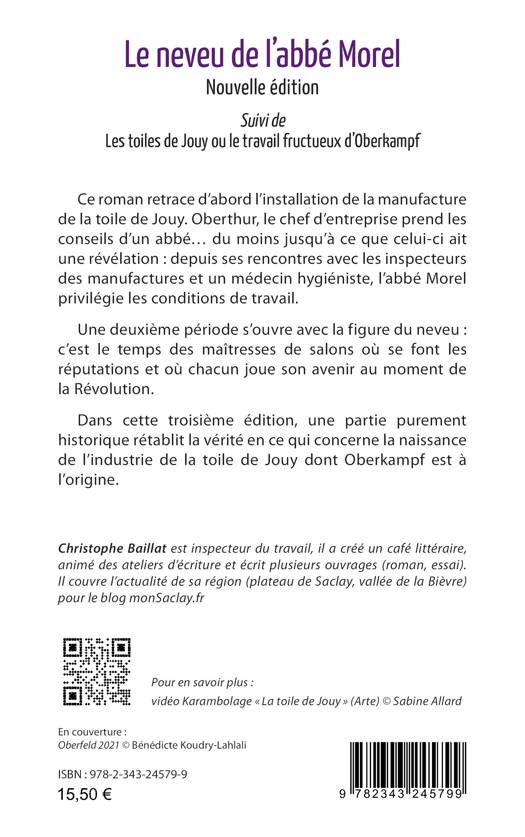 Ce roman retrace d’abord l’installation de la manufacture de la toile de Jouy. Oberthur, le chef d’entreprise prend les conseils d’un abbé… du moins jusqu’à ce que celui-ci ait une révélation : depuis ses rencontres avec les inspecteurs des manufactures et un médecin hygiéniste, l’abbé Morel privilégie les conditions de travail. Une deuxième période s’ouvre avec la figure du neveu : c’est le temps des maîtresses de salons où se font les réputations et où chacun joue son avenir au moment de la Révolution. Dans cette troisième édition, une partie purement historique rétablit la vérité en ce qui concerne la naissance de l’industrie de la toile de Jouy dont Oberkampf est à l’origine.