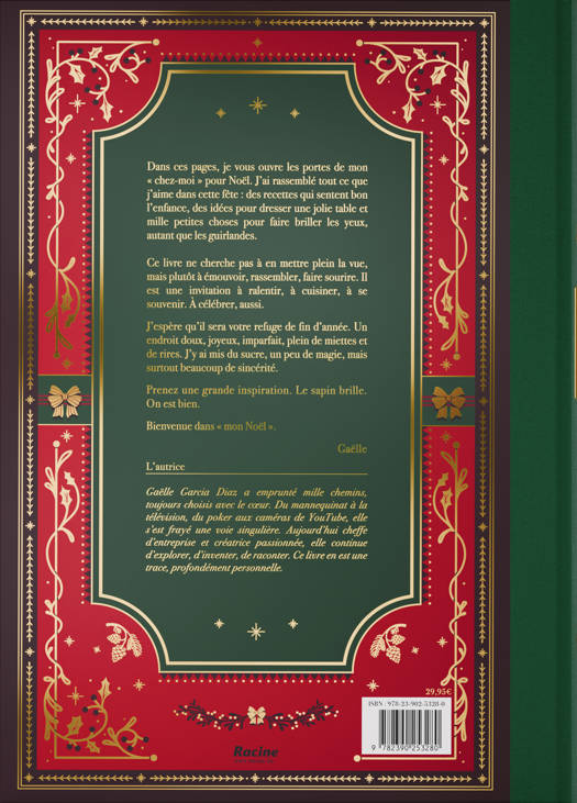 Dans ces pages, je vous ouvre les portes de mon « chez-moi » pour Noël. J'ai rassemblé tout ce que j'aime dans cette fête : des recettes qui sentent bon l'enfance, des idées pour dresser une jolie table et mille petites choses pour faire briller les yeux, autant que les guirlandes. Ce livre ne cherche pas à en mettre plein la vue, mais plutôt à émouvoir, rassembler, faire sourire. Il est une invitation à ralentir, à cuisiner, à se souvenir. À célébrer, aussi. J'espère qu'il sera votre refuge de fin d'année. Un endroit doux, joyeux, imparfait, plein de miettes et de rires. J'y ai mis du sucre, un peu de magie, mais surtout beaucoup de sincérité. Prenez une grande inspiration. Le sapin brille. On est bien. Bienvenue dans « mon Noël ». Gaëlle