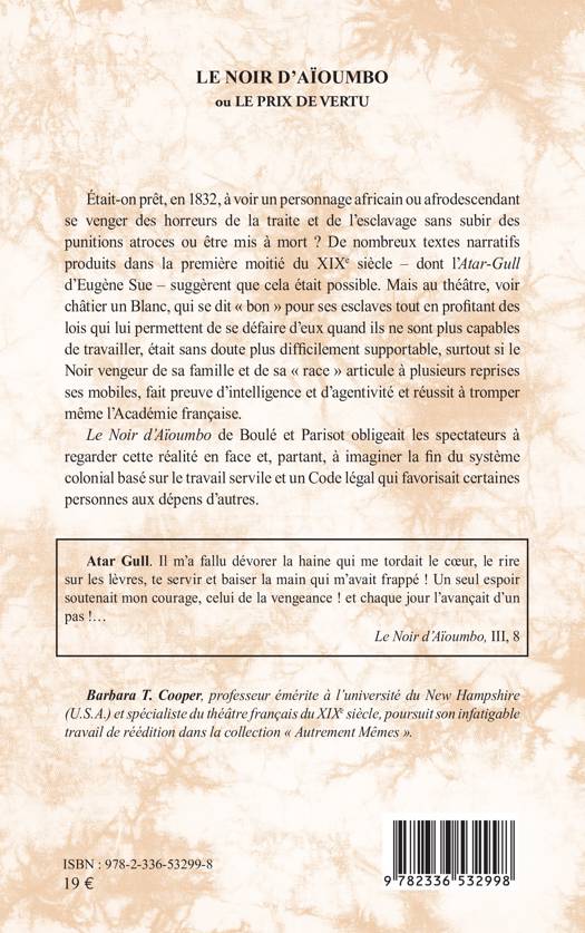Atar-Gull d'Eugène Sue - suggèrent que cela était possible. Mais au théâtre, voir châtier un Blanc, qui se dit bon pour ses esclaves tout en profitant des lois qui lui permettent de se défaire d'eux quand ils ne sont plus capables de travailler, était sans doute plus difficilement supportable, surtout si le Noir vengeur de sa famille et de sa race articule à plusieurs reprises ses mobiles, fait preuve d'intelligence et d'agentivité et réussit à tromper même l'Académie française.