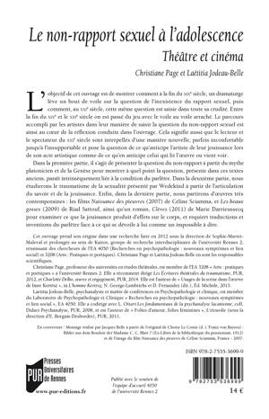 Cet ouvrage montre comment à la fin du XIXe siècle un dramaturge lève un bout de voile sur la question de l'inexistence du rapport sexuel, puis comment au XXIe siècle, cette même question est saisie dans toute sa crudité au cinéma et en littérature. Il analyse L'éveil du printemps de Wedekind, préfacé par Lacan, et deux films (Naissance des pieuvres de Céline Sciamma et Les Beaux Gosses de Riad Sattouf) ainsi qu'un roman (Clèves de Marie Darrieusecq).