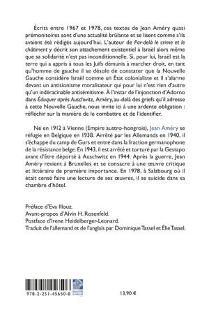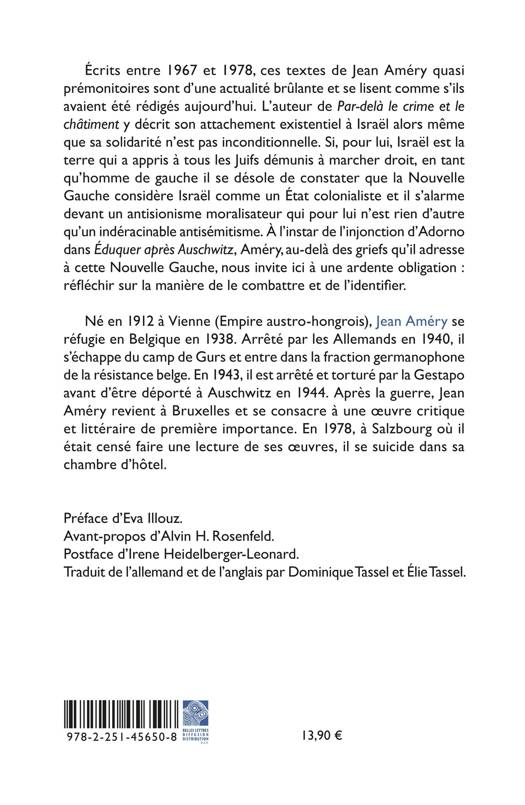 Ecrits entre 1967 et 1978, ces textes de Jean Amery quasi premonitoires sont d'une actualite brulante et se lisent comme s'ils avaient ete rediges aujourd'hui. L'auteur de Par-dela le crime et le chatiment y decrit son attachement existentiel a Israel alors meme que sa solidarite n'est pas inconditionnelle. Si, pour lui, Israel est la terre qui a appris a tous les Juifs demunis a marcher droit, en tant qu'homme de gauche il se desole de constater que la Nouvelle Gauche considere Israel comme un Etat colonialiste et il s'alarme devant un antisionisme moralisateur qui pour lui n'est rien d'autre qu'un inderacinable antisemitisme. A l'instar de l'injonction d'Adorno dans Eduquer apres Auschwitz, Amery, au dela des griefs qu'il adresse a cette Nouvelle Gauche, nous invite ici a une ardente obligation: reflechir sur la maniere de le combattre et de l'identifier.