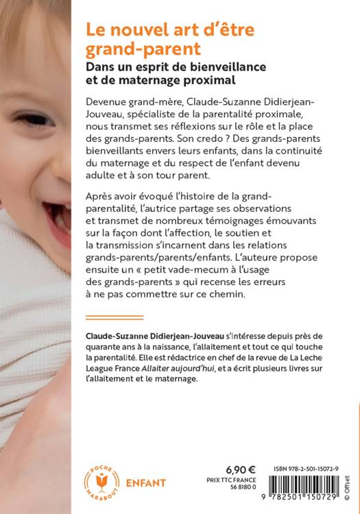 Devenue grand-mère, Claude-Suzanne Didierjean-Jouveau, spécialiste de la parentalité proximale, nous transmet ses réflexions sur le rôle et la place des grands-parents. Son credo ? Des grands-parents bienveillants envers leurs enfants, dans la continuité du maternage et du respect de l’enfant devenu adulte et à son tour parent. Après avoir évoqué l’histoire de la grandparentalité, l’autrice partage ses observations et transmet de nombreux témoignages émouvants sur la façon dont l’affection, le soutien et la transmission s’incarnent dans les relations grands-parents/parents/enfants. L’auteure propose ensuite un « petit vade-mecum à l’usage des grands-parents » qui recense les erreurs à ne pas commettre sur ce chemin.