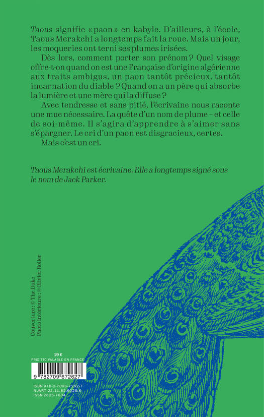 Taous Merakchi cherche Taous, le paon, dans la mythologie grecque, dans la religion yézidie, dans l’hindouisme, nous entraînant au cœur des légendes, partout où se trouve cet oiseau fascinant dont l’apparence contraste tant avec le cri. Ainsi un portrait du paon se dessine peu à peu, la fois mystique et ringard, banal et exceptionnel, majestueux et criard, autant d’ambivalences qui renvoient Taous, l’autrice, à ses propres contradictions et à son identité de femme d’origine kabyle, qu’elle a commencé par cacher sous le pseudonyme de Jack Parker.