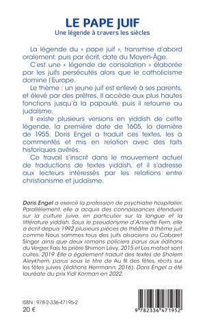 La légende du « pape juif », transmise d’abord oralement, puis par écrit, date du Moyen-Âge. C’est une « légende de consolation » élaborée par les juifs persécutés alors que le catholicisme domine l’Europe. Le thème : un jeune juif est enlevé à ses parents, et élevé par des prêtres. Il accède aux plus hautes fonctions jusqu’à la papauté, puis il retourne au judaïsme. Il existe plusieurs versions en yiddish de cette légende, la première date de 1605, la dernière de 1955. Doris Engel a traduit ces textes, les a commentés et mis en relation avec des faits historiques avérés. Ce travail s’inscrit dans le mouvement actuel de traductions de textes yiddish, et il s’adresse aux lecteurs intéressés par les relations entre christianisme et judaïsme.