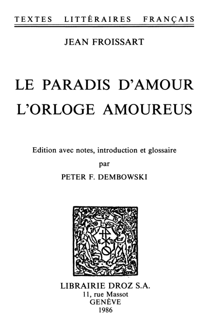 Ces poèmes narratifs n'ont connu qu'une édition à ce jour (Scheler 1870) aujourd'hui introuvable. Pour la présente édition Peter F. Dembowski s'est basé sur deux manuscrits conservés à la Bibliothèque nationale (fr. 830 et fr. 831). Le Paradis d'amour est conservé dans les deux alors que l'Orloge amoureus n'a été copié que dans le second. M. Dembowski a retenu la version du Paradis d'Amour contenue dans le premier manuscrit (f. fr. 830) car elle est plus proche du dialecte picard de Froissard. Selon le critique, le Paradis d'amour aurait été écrit entre le commencement de 1361 et la fin de 1362 et l'Orloge amoureus au milieu de 1368 en décasyllabes à rimes plates, contrairement à la plupart des dits narratifs de Froissard. Le glossaire de M. Dembowski est suivi d'un index des termes d'horlogerie qui témoigne de l'importance de l'Orloge amoureus pour l'histoire de l'horlogerie.