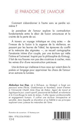 Comment s'abandonner à l'autre sans se perdre soi-même ? Le paradoxe de l'amour explore la contradiction fondamentale entre le désir de fusion amoureuse et la crainte de la perte de soi. À travers un voyage initiatique en cinq actes - de l'ivresse de la fusion à la sagesse de la résilience, en passant par les leurres de l'idéal, les épreuves du conflit et la mémoire des stigmates -, ce recueil cartographie l'anatomie intime d'un couple, par une écriture qui mêle l'intime et l'universel. Inspiré par la philosophie du Kintsugi, il fait de nos fissures non pas des cicatrices à cacher, mais les veines d'or d'une reconstruction précieuse. Une écriture qui s'adresse à tous ceux qui voient dans la poésie un langage pour apprivoiser les chaos de l'amour et en extraire la lumière.