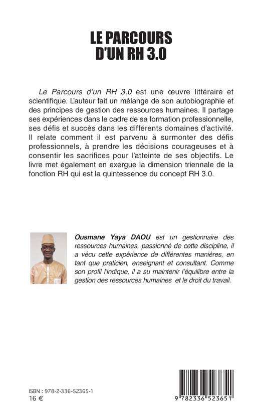 Le Parcours d'un RH 3.0 est une oeuvre littéraire et scientifique. L'auteur fait un mélange de son autobiographie et des principes de gestion des ressources humaines. Il partage ses expériences dans le cadre de sa formation professionnelle, ses défis et succès dans les différents domaines d'activité. Il relate comment il est parvenu à surmonter des défis professionnels, à prendre les décisions courageuses et à consentir les sacrifices pour l'atteinte de ses objectifs. Le livre met également en exergue la dimension triennale de la fonction RH qui est la quintessence du concept RH 3.0.