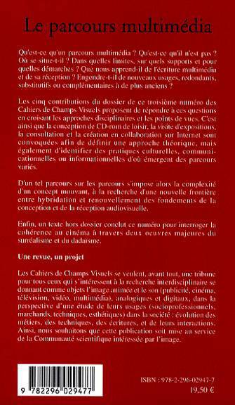 Ces contributions proposent une approche interdisciplinaire de ce qu'est un parcours multimédia : conception de CD-rom de loisir, visite d'expositions, consultation et création en collaboration sur Internet sont ainsi analysés par le prisme théorique des pratiques culturelles, communicationnelles ou informationnelles. Enfin, un texte hors-dossier examine la notion de cohérence au cinéma à travers deux oeuvres du surréalisme et du dadaïsme.