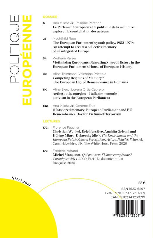 Des contributions consacrées au Parlement européen en tant que chambre de débats et de résolutions relatifs à l'interprétation de l'histoire du continent. Les auteurs montrent les logiques de construction de ce cadre mémoriel et ses implications en termes de politiques publiques européennes.