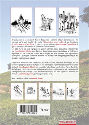 À Lyon, dans le Lyonnais et dans le Beaujolais – comme ailleurs dans le pays – le français parlé est émaillé de mots (débarouler, gone, radée…), de locutions (à cacaboson, tu m’fais flique…), de tours grammaticaux (j’suis trempé, j’y sais bien…) qui lui donnent une couleur et une saveur particulières. Les 200 mots les plus typiques du parler lyonnais et/ou beaujolais sélectionnés par Jean-Baptiste Martin sont illustrés d’exemples savoureux tirés de la littérature régionale ou de collectes orales. Leur origine et leur histoire sont également expliquées (la plupart viennent du latin, les autres sont d’origine germanique ou gauloise ou onomatopéique).