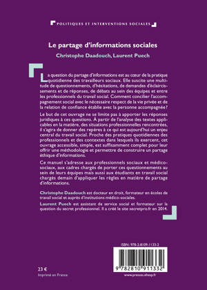 La question du partage d’informations est au coeur de la pratique quotidienne des travailleurs sociaux. Elle suscite une multitude de questionnements, d’hésitations, de demandes d’éclaircissements et de réponses, de débats au sein des équipes et entre les professionnels du travail social. Comment concilier l’accompagnement social avec le nécessaire respect de la vie privée et de la relation de confiance établie avec la personne accompagnée ? Le but de cet ouvrage ne se limite pas à apporter les réponses juridiques à ces questions. À partir de l’analyse des textes applicables en la matière, des situations professionnelles rencontrées, il s’agira de donner des repères à ce qui est aujourd’hui un enjeu central du travail social. Proche des pratiques quotidiennes des professionnels et des contextes dans lesquels ils exercent, cet ouvrage accessible, simple, est suffisamment complet pour leur offrir une méthodologie et permettre de construire un partage éthique d’informations. Ce manuel s’adresse aux professionnels sociaux et médico-sociaux, aux cadres chargés de porter ces questionnements au sein de leurs équipes mais aussi aux étudiants en travail social chargés demain d’appliquer les règles en matière de partage d’informations.