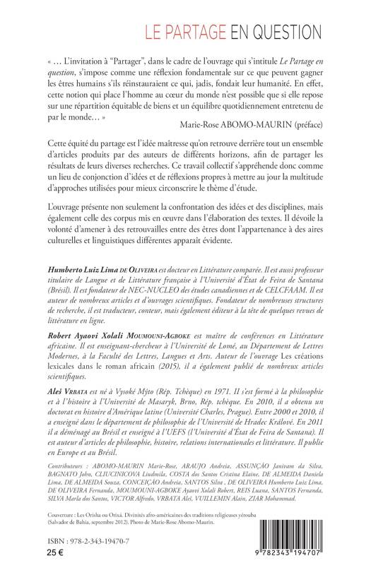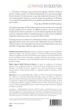 Cette équité du partage est l’idée maîtresse qu’on retrouve derrière tout un ensemble d’articles produits par des auteurs de différents horizons, afin de partager les résultats de leurs diverses recherches. Ce travail collectif s’appréhende donc comme un lieu de conjonction d’idées et de ré exions propres à mettre au jour la multitude d’approches utilisées pour mieux circonscrire le thème d’étude. L’ouvrage présente non seulement la confrontation des idées et des disciplines, mais également celle des corpus mis en oeuvre dans l’élaboration des textes. Il dévoile la volonté d’amener à des retrouvailles entre des êtres dont l’appartenance à des aires culturelles et linguistiques différentes apparaît évidente.