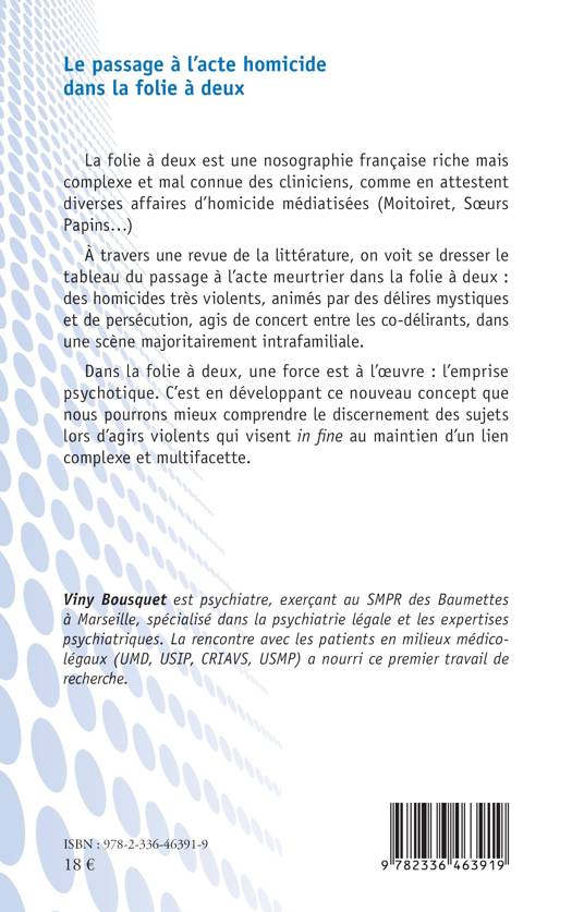 La folie à deux est une nosographie française riche mais complexe et mal connue des cliniciens, comme en attestent diverses affaires d'homicide médiatisées (Moitoiret, Soeurs Papins...) À travers une revue de la littérature, on voit se dresser le tableau du passage à l'acte meurtrier dans la folie à deux des homicides très violents, animés par des délires mystiques et de persécution, agis de concert entre les co-délirants, dans une scène majoritairement intrafamiliale. Dans la folie à deux, une force est à l'oeuvre l'emprise psychotique. C'est en développant ce nouveau concept que nous pourrons mieux comprendre le discernement des sujets lors d'agirs violents qui visent in fine au maintien d'un lien complexe et multifacette.