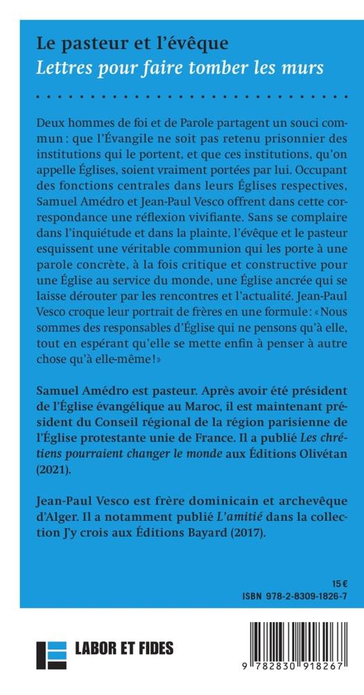 Deux hommes de foi et de Parole partagent un souci commun: que l’Évangile ne soit pas retenu prisonnier des institutions qui le portent. Et ces institutions, qu’on appelle Églises, sont-elles encore portées par lui? Occupant des fonctions centrales dans leurs Églises respectives, Samuel Amédro et Jean-Paul Vesco offrent dans cette correspondance une réflexion vivifiante. Sans se complaire dans l’inquiétude et dans la plainte, l’évêque et le pasteur esquissent une véritable communion qui les porte à une parole concrète, à la fois critique et constructive pour une Église au service du monde, une Église ancrée qui se laisse dérouter par les rencontres et l’actualité. Jean-Paul Vesco croque leur portrait de frères en une formule: «Nous sommes des responsables d’Église qui ne pensons qu’à leur Église en rêvant qu’elle se mette enfin à penser à autre chose qu’à elle-même!»