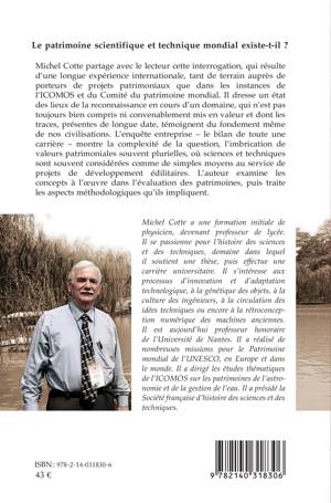 Le patrimoine scientifique et technique mondial existe-t-il ? Michel Cotte partage avec le lecteur cette interrogation, qui résulte d'une longue expérience internationale, tant de terrain auprès de porteurs de projets patrimoniaux que dans les instances de l'ICOMOS et du Comité du patrimoine mondial. Il dresse un état des lieux de la reconnaissance en cours d'un domaine, qui n'est pas toujours bien compris ni convenablement mis en valeur et dont les traces, présentes de longue date, témoignent du fondement même de nos civilisations. L'enquête entreprise - le bilan de toute une carrière - montre la complexité de la question, l'imbrication de valeurs patrimoniales souvent plurielles, où sciences et techniques sont souvent considérées comme de simples moyens au service de projets de développement édilitaires. L'auteur examine les concepts à l'oeuvre dans l'évaluation des patrimoines, puis traite les aspects méthodologiques qu'ils impliquent.