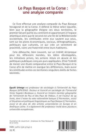 Ce livre effectue une analyse comparée du Pays Basque hexagonal et de la Corse. Il défend la thèse selon laquelle, bien que la géographie éloigne ces deux territoires, le premier faisant partie du continent et appartenant à l'espace atlantique alors que le second est une île de la Méditerranée occidentale, les similitudes entre eux sautent aux yeux, tant sur les plans économiques, sociaux, démographiques, politiques que culturels, ce qui crée un sentiment de proximité, voire une fraternité entre leurs habitants. Cela débouche, bien souvent, sur un intérêt réciproque pour les réflexions menées, les idées développées, les initiatives prises, les actions mises en oeuvre et les politiques publiques conçues puis appliquées. D'où l'intérêt de mener une étude comparative entre le Pays Basque et la Corse afin de mettre en exergue les différences, mais aussi les similitudes entre ces territoires singuliers dotés de fortes identités.