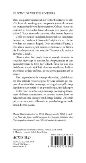 Ce livre met en scène un personnage poétique qui lentement révèle ses traumatismes, ses amours, ses utopies et son bel acharnement à protéger son héritage familial. Un roman qui retrace non sans mélancolie les grands changements du Japon d'après-guerre.