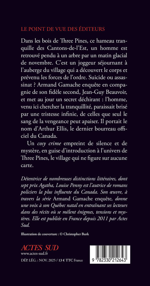 Dans les bois de Three Pines, ce hameau tranquille des Cantons-de-l'Est, un homme est retrouvé pendu à un arbre par un matin glacial de novembre. C'est un joggeur séjournant à l'auberge du village qui a découvert le corps et prévenu les forces de l'ordre. Suicide ou assassinat ? Armand Gamache enquête en compagnie de son fidèle second, Jean-Guy Beauvoir, et met au jour un secret déchirant : l'homme, venu ici chercher la tranquillité, paraissait brisé par une tristesse infinie, de celles que seul le sang de la vengeance peut apaiser. Il portait le nom d'Arthur Ellis, le dernier bourreau officiel du Canada. Un cosy crime empreint de silence et de mystère, en guise d'introduction à l'univers de Three Pines, le village qui ne figure sur aucune carte.