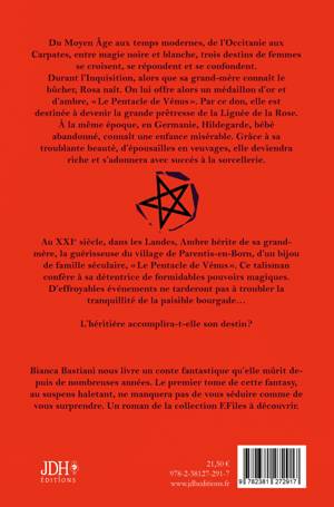 Du Moyen Âge aux temps modernes, de l'Occitanie aux Carpates, entre magie noire et blanche, trois destins de femmes se croisent, se répondent et se confondent. Durant l'Inquisition, alors que sa grand-mère connaît le bûcher, Rosa naît. On lui offre alors un médaillon d'or et d'ambre, Le Pentacle de Vénus . Par ce don, elle est destinée à devenir la grande prêtresse de la Lignée de la Rose. À la même époque, en Germanie, Hildegarde, bébé abandonné, connaît une enfance misérable. Grâce à sa troublante beauté, d'épousailles en veuvages, elle deviendra riche et s'adonnera avec succès à la sorcellerie. Au XXIe siècle, dans les Landes, Ambre hérite de sa grand-mère, la guérisseuse du village de Parentis-en-Born, d'un bijou de famille séculaire, Le Pentacle de Vénus . Ce talisman confère à sa détentrice de formidables pouvoirs magiques. D'effroyables événements ne tarderont pas à troubler la tranquillité de la paisible bourgade... L'héritière accomplira-t-elle son destin ? Bianca Bastiani nous livre un conte fantastique qu'elle mûrit depuis de nombreuses années. Le premier tome de cette fantasy, au suspens haletant, ne manquera pas de vous séduire comme de vous surprendre. Un roman de la collection F.Files à découvrir.