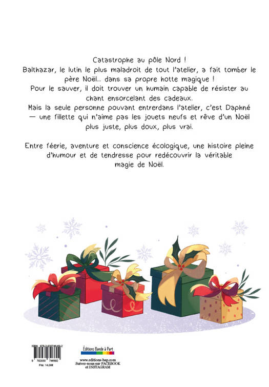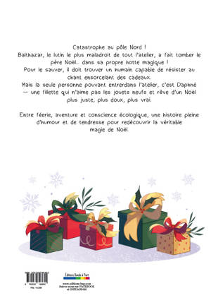 Catastrophe au pôle Nord !Balthazar, le lutin le plus maladroit de tout l’atelier, a fait tomber le père Noël... dans sa propre hotte magique !Pour le sauver, il doit trouver un humain capable de résister au chant ensorcelant des cadeaux.Mais la seule personne pouvant entrer dans l’atelier, c’est Daphné— une fillette qui n’aime pas les jouets neufs et rêve d’un Noël plus juste, plus doux, plus vrai.Entre féerie, aventure et conscience écologique, une histoire pleine d’humour et de tendresse pour redécouvrir la véritablemagie de Noël.