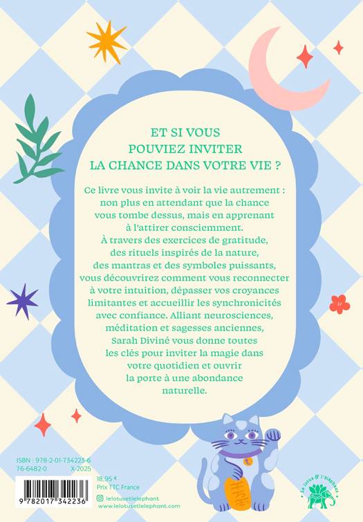 Ce livre vous invite à voir la vie autrement : non plus en attendant que la chance vous tombe dessus, mais en apprenant à l’attirer consciemment. À travers des exercices de gratitude, des rituels inspirés de la nature, des mantras et des symboles puissants, vous découvrirez comment vous reconnecter à votre intuition, dépasser vos croyances limitantes et accueillir les synchronicités avec confiance. Alliant neurosciences, méditation et sagesses anciennes, Sarah Diviné vous donne toutes les clés pour inviter la magie dans votre quotidien et ouvrir la porte à une abondance naturelle.
