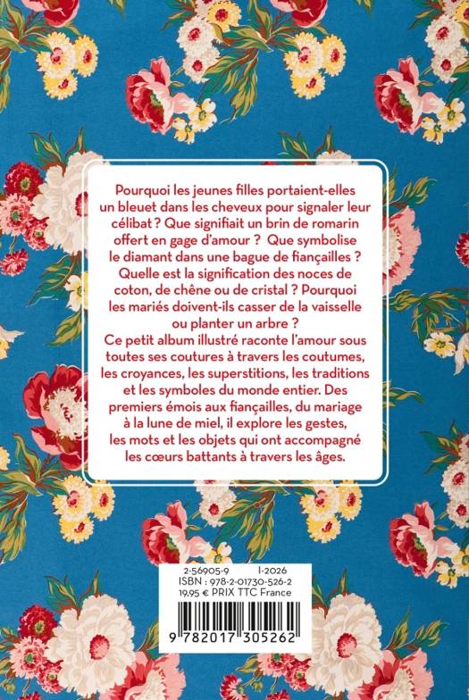 Pourquoi les jeunes filles portaient-elles un bleuet dans les cheveux pour signaler leur célibat ? Que signifiait un brin de romarin offert en gage d’amour ? Que symbolise le diamant dans une bague de fiançailles ? Quelle est la signification des noces de coton, de chêne ou de cristal ? Pourquoi les mariés doivent-ils casser de la vaisselle ou planter un arbre ? Ce petit album illustré raconte l’amour sous toutes ses coutures à travers les coutumes, les croyances, les superstitions, les traditions et les symboles du monde entier. Des premiers émois aux fiançailles, du mariage à la lune de miel, il explore les gestes, les mots et les objets qui ont accompagné les cœurs battants à travers les âges.