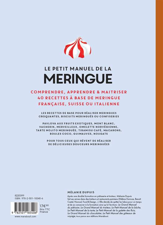 Comprendre, apprendre & maîtriser 40 recettes à base de meringue française, suisse ou italienne Apprenez les recettes de base pour réaliser meringues croquantes, biscuits meringués ou confiseries. Pavlova aux fruits exotiques, mont blanc, vacherin, merveilleux, omelette norvégienne, tarte mojito meringuée, tiramisu café, macarons, boules coco, guimauves, nougats. Le livre idéal pour tous ceux qui rêvent de réaliser de délicieuses douceurs meringuées.
