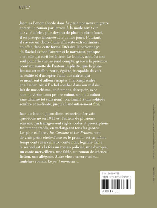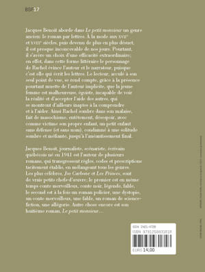 Jacques Benoit aborde dans Le petit monsieur un genre ancien: le roman par lettres. À la mode aux XVIIe et XVIIIe siècles, puis devenu de plus en plus désuet, il est presque inconcevable de nos jours. Pourtant, il s’avère un choix d’une efficacité extraordinaire; en effet, dans cette forme littéraire le personnage de Rachel évince l’auteur et le narrateur, puisque c’est elle qui écrit les lettres. Le lecteur, acculé à son seul point de vue, se rend compte, grâce à la présence pourtant muette de l’auteur implicite, que la jeune femme est malheureuse, égoïste, incapable de voir la réalité et d’accepter l’aide des autres, qui se montrent d’ailleurs inaptes à la comprendre et à l’aider. Ainsi Rachel sombre dans son malaise, fait de masochisme, entêtement, désespoir, avec comme victime son propre enfant, un petit enfant sans défense (et sans nom), condamné à une solitude sombre et méfiante, jusqu’à l’anéantissement final.