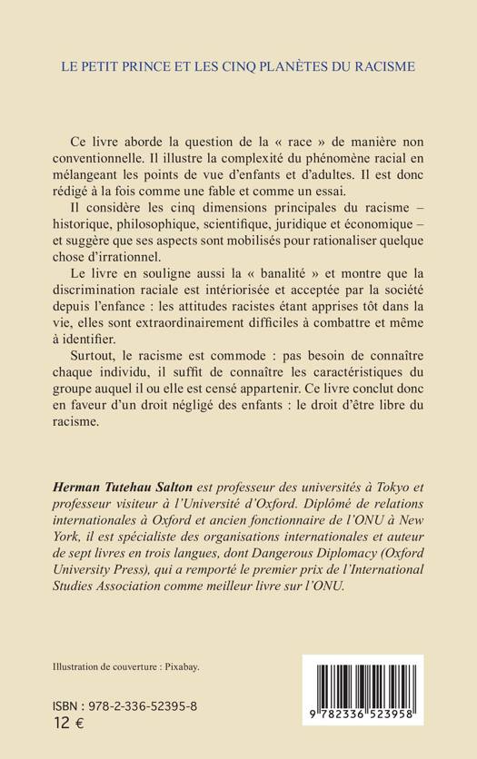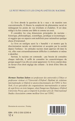 Ce livre aborde la question de la race de manière non conventionnelle. Il illustre la complexité du phénomène racial en mélangeant les points de vue d'enfants et d'adultes. Il est donc rédigé à la fois comme une fable et comme un essai. Il considère les cinq dimensions principales du racisme - historique, philosophique, scientifique, juridique et économique - et suggère que ses aspects sont mobilisés pour rationaliser quelque chose d'irrationnel. Le livre en souligne aussi la banalité et montre que la discrimination raciale est intériorisée et acceptée par la société depuis l'enfance les attitudes racistes étant apprises tôt dans la vie, elles sont extraordinairement difficiles à combattre et même à identifier. Surtout, le racisme est commode pas besoin de connaître chaque individu, il suffit de connaître les caractéristiques du groupe auquel il ou elle est censé appartenir. Ce livre conclut donc en faveur d'un droit négligé des enfants le droit d'être libre du racisme.