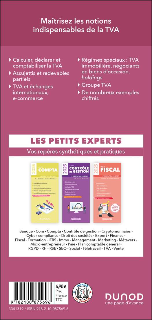 En 48 pages et  16 fiches pratiques, le  Petit TVA fournit toutes les notions indispensables pour calculer, déclarer et comptabiliser la TVA, avec de nombreux exemples chiffrés, en présentant notamment :