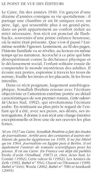 Le Caire, fin des années 1940. Un garçon d'une dizaine d'années consigne sa vie quotidienne : il partage une chambre et un lit uniques avec un père, âgé, qui ressemble plus à un grand-père, dans un petit appartement au confort réduit au strict nécessaire. Son récit est ponctué de flashbacks, souvenirs d'une prime enfance heureuse, où la mère était présente. Que s'est-il passé ? Luimême semble l'ignorer. Lentement, au fil des pages, l'histoire familiale va se révéler, au lecteur en même temps qu'au narrateur. Accroché à ce père qui lutte désespérément contre la déchéance physique et le déclassement social, l'enfant solitaire essaie de comprendre le monde mystérieux des adultes. Il écoute aux portes, espionne à travers les trous de serrure, fouille les tiroirs et les placards, lit les livres interdits. Dans ce récit poignant, largement autobiographique, Sonallah Ibrahim renoue avec l'écriture objectiviste et l'attention extrême portée au détail caractéristiques de son premier roman, Cette odeurlà (Actes Sud, 1992), qui révolutionna l'écriture arabe. En restituant au plus près le regard de l'enfant qu'il a été, avec ses peurs, ses désirs, ses interrogations, il donne à son récit une charge émotive exceptionnelle et livre une de ses oeuvres les plus fortes. «Né en 1937 au Caire, Sonallah Ibrahim a fait des études de journalisme. Arrêté avec des centaines d'autres militants de gauche égyptienne en 1959, il ne fut libéré qu'en 1964. Journaliste en Egypte puis à Berlin, il est également l'auteur de romans scientifiques pour les jeunes. Il vit au Caire. En France ont déjà été publiés Etoile d'août (Sindbad, 1987) et, chez Actes Sud, Le Comité (1992), Cette odeur-là (1992), Les Années de Zeth (1993, Babel n° 554), Charaf ou l'Honneur (1999, Babel n° 644), Warda (2002, Babel n° 708) et Amrikanli (2005).»