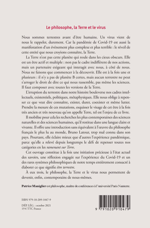 Nous sommes terrestres avant d'être humains. Un virus vient de nous le rappeler, durement. Car la pandémie de Covid-19 est aussi la manifestation d'un événement plus complexe et plus terrible : le réveil de cette entité que nous croyions connaître, la Terre. La Terre n'est pas cette planète qui roule dans les cieux obscurs. Elle est un être actif et multiple : non pas le cadre indifférent de nos actions, mais un partenaire exigeant qui interagit avec nous, à côté de nous. Nous ne faisons que commencer à la découvrir. Elle est à la fois une et plusieurs : il n'y a pas de planète B certes, mais aucun terrestre ne peut s'arroger le droit de dire ce qui nous rassemble, pas même les sciences. Il faut composer avec toutes les versions de la Terre. L'irruption du terrestre dans notre histoire bouleverse nos cadres intellectuels, existentiels, politiques, métaphysiques. Elle nous oblige à repenser ce que veut dire connaître, exister, durer, coexister et même lutter. Prendre la mesure de ces mutations, esquisser le visage de cet être à la fois très ancien et très nouveau qu'on appelle Terre, tel est l'enjeu de ce livre. Il mobilise pour cela les recherches les plus contemporaines des sciences naturelles et des sciences humaines, qu'il restitue dans une langue claire et vivante. Il offre une introduction sans équivalent à l'oeuvre du philosophe français le plus lu au monde, Bruno Latour, trop mal connu dans son pays. Pourtant, elle éclaire mieux que d'autres l'expérience pandémique, parce qu'elle a relevé depuis longtemps le défi de repenser toutes nos catégories en les ramenant sur Terre. Cet ouvrage constitue à la fois une initiation précieuse à l'état actuel des savoirs, une réflexion engagée sur l'expérience du Covid-19 et un des rares systèmes philosophiques de notre temps entièrement consacré à élaborer ce que signifie être terrestre. À eux trois, le philosophe, la Terre et le virus nous permettent de devenir, enfin, contemporains de nous-mêmes.