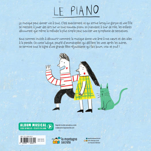 La musique peut donner vie à tout. C'est exactement ce qui arrive lorsqu'un garçon et une fille se mettent à jouer des airs sur un tout nouveau piano. En pianotant à tour de rôle, les enfants découvrent que même la mélodie la plus simple peut susciter une symphonie de sensations. Nous sommes invités à découvrir comment la musique donne une âme à nos coeurs et des ailes à la pensée. Ce magnifique album, sans texte, est ludique, peuplé d'onomatopées qui défilent les unes après les autres, se termine sous le signe d'une grande fête réjouissante qui fait boum, crac et pouf !